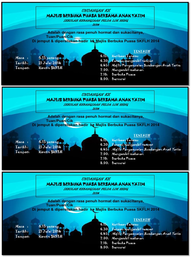 Ia adalah jumadi, petugas keamanan kantor. Buat isteri isteri pasti teruja untuk menghidangkan makanan lazat penuh khasiat sebagai menu berbuka puasa untuk keluarga. Text of contoh surat jemputan majlis. Semua template kad jemputan ini boleh digunakan untuk kegunaan peribadi dan komersil. Di warung ini, kamu bersama rombongan keluarga bisa berbuka dengan nasi kebuli dan kambing oven yang.